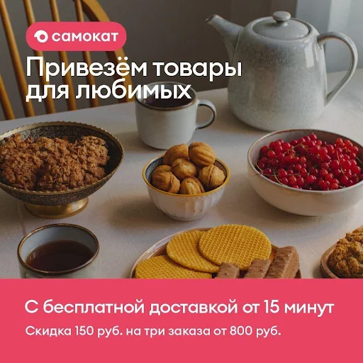 Российский онлайн-сервис заказа продуктов питания и товаров для дома с бесплатной доставкой из дарксторов от 15 минут.